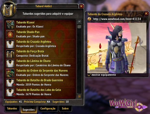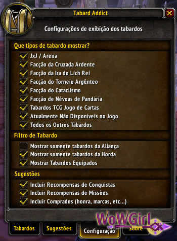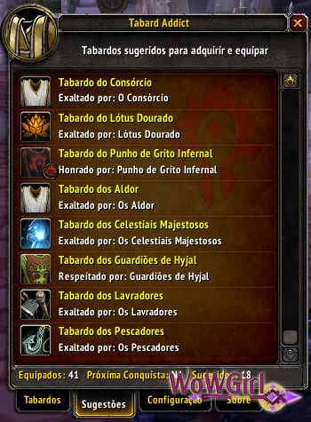 Esse é addon é um anjo na hora de descobrir quais tabardos você por acaso tem e não equipou. Mas ele funciona também para mostrar os locais e moedas necessárias para conseguir um tabardo, ou se ele é de missão, reputação ou drop. Nas configurações, dá pra ajustar quais facções e tipos de Tabardo você quer ou não que sejam exibidos.