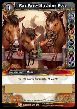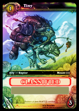 - A carta Tiny lhe concede uma montaria temporária, que você pode resgatar Bridão de Pequeno Garanhão Branco para a aliança ou a Apito de Pequeno Raptor Marfim para a horda. (1/11)