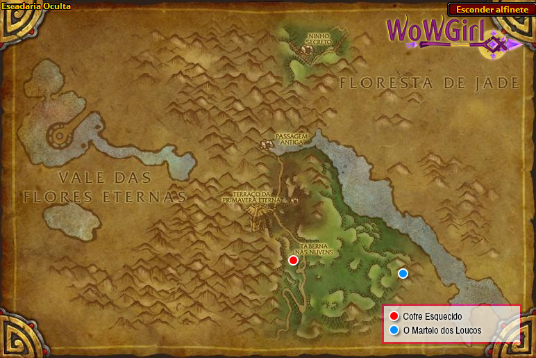 - Armário do Navio [70,74]: esse baú fica dentro de uma embarcação afundada ao sul da Floresta de Jade, próximo ao ponto das missões iniciais da Aliança. Clique aqui para ver uma imagem do local e um mapa ampliado.
