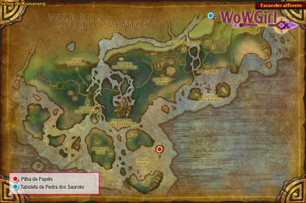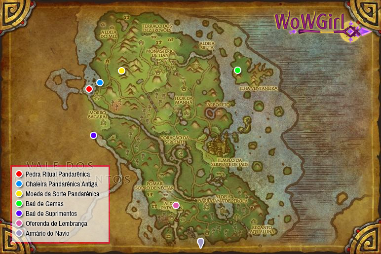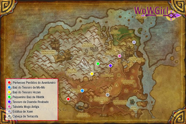 Nos mapas abaixo é possível ver a localização de cada objeto por região de Pandaria. Todos os itens/PNJs relacionados à conquista estarão devidamente marcados, com as coordenadas resumidas logo em baixo. Não vou entrar em detalhes sobre cada item (mas para vê-los, basta passar o mouse por cima do nome para ver sua descrição), mas as coordenadas e qualquer informação útil para ajudar a localizar cada objeto selecionado será especificada.