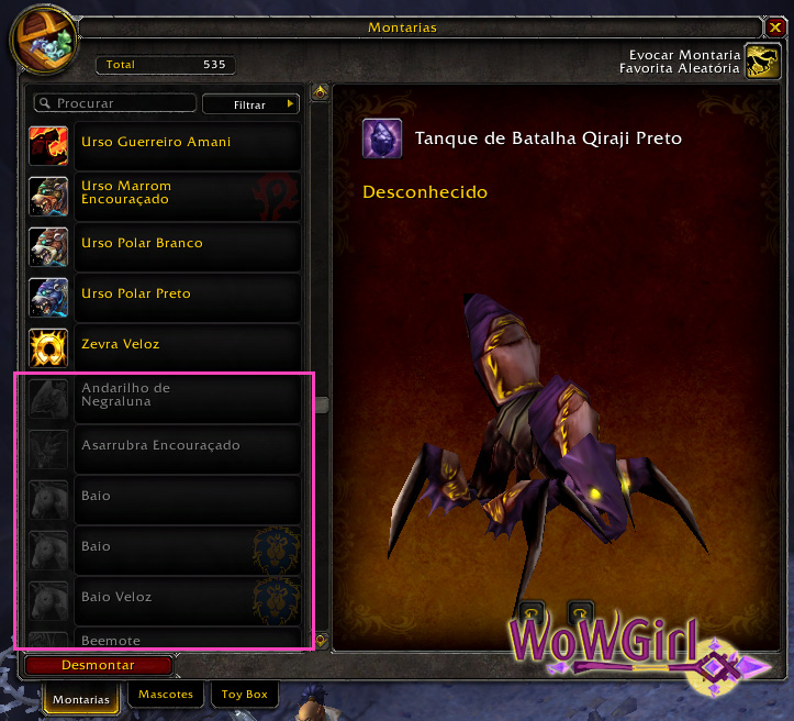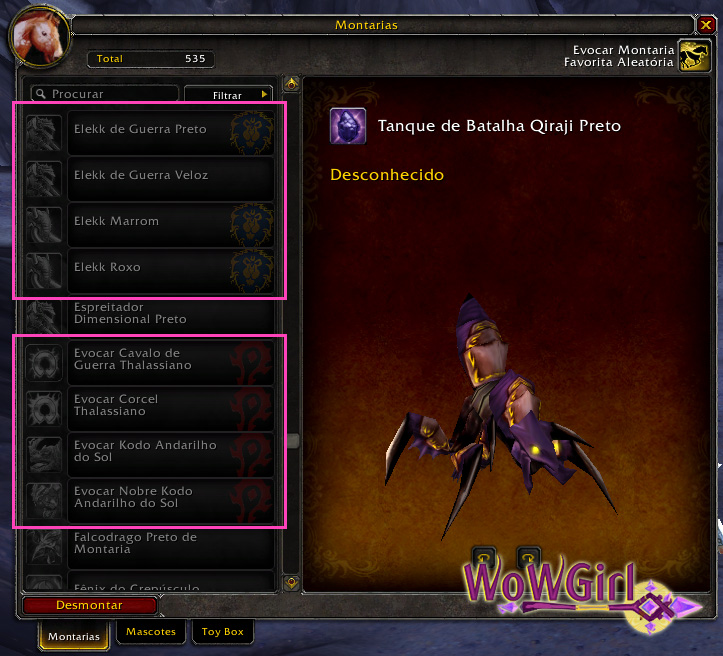 Pra você que tem alts na facção oposta ou simplesmente quer saber quais montarias você tem e que não podem ser usadas por outras facções.