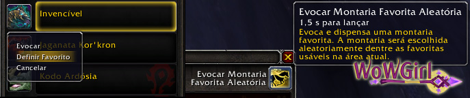 Hora que eu vi esse botão aqui eu quase dei um salto ornamental <3. Hoje eu uso duas macros para selecionar entre montarias terrestres e voadoras predefinidas, e algumas pessoas usam addons para essa finalidade, mas em WoD esta função será nativa da interface do jogo *-*. Para definir uma montaria favorita, basta clicar com o botão direito em cima do ícone dela e usar a opção ‘Definir Favorito’.
