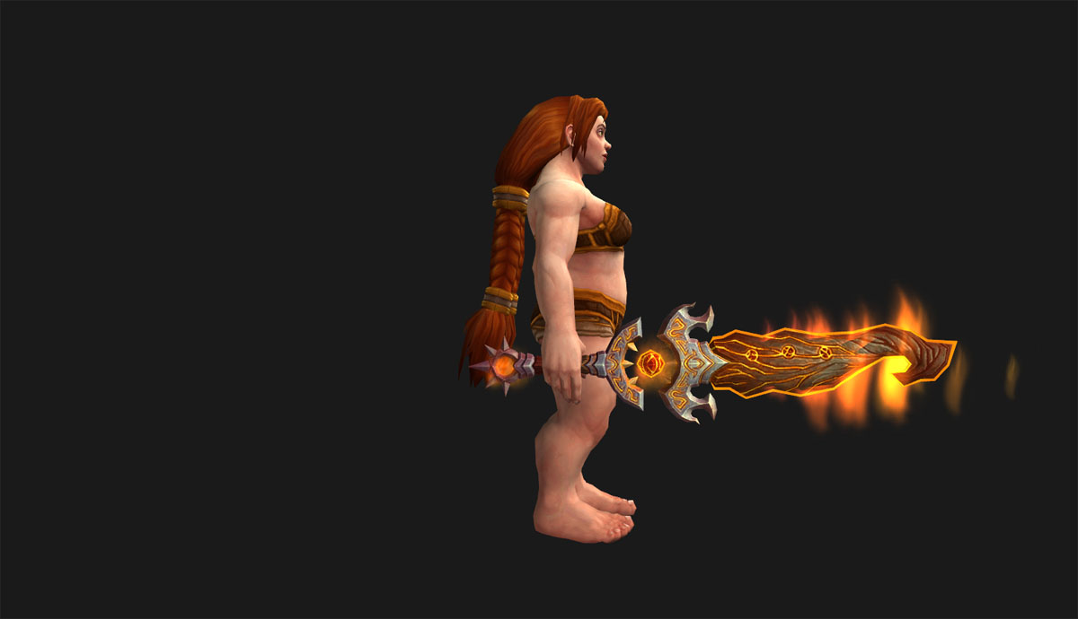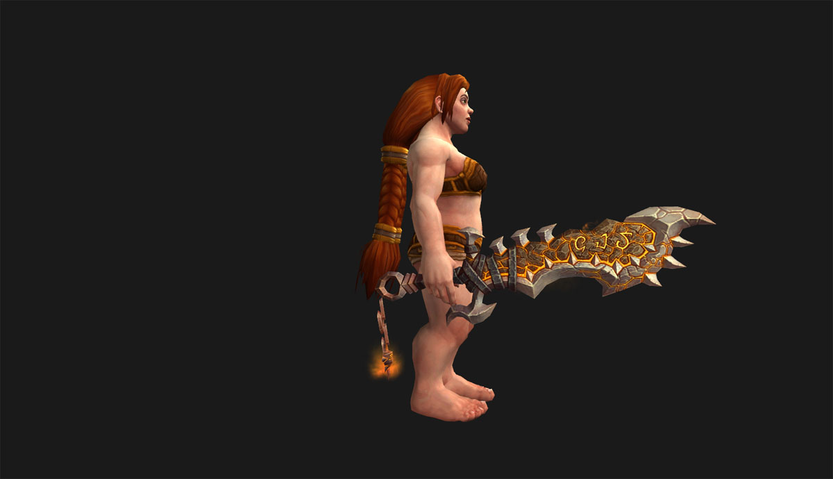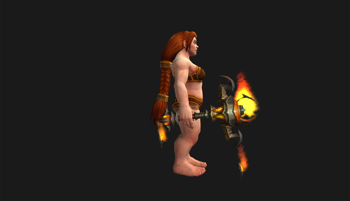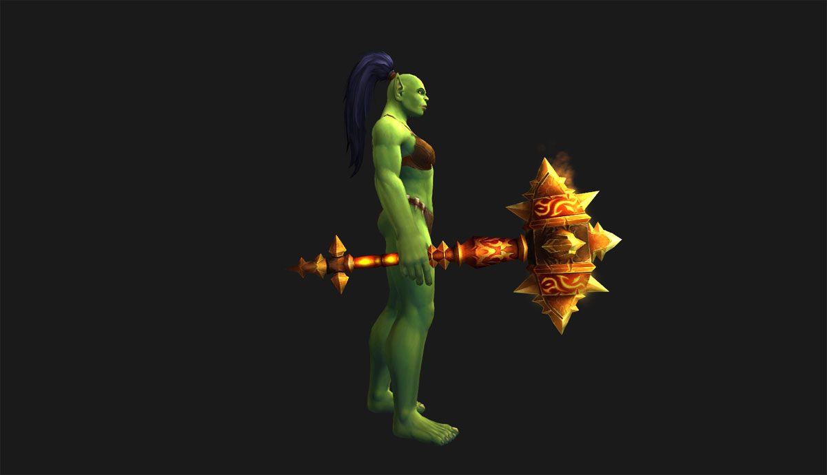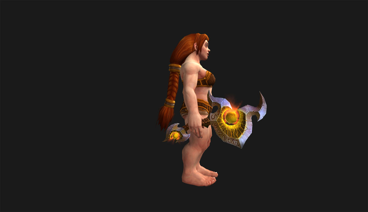 - Apesar do fato de nenhuma arma lendária poder ser usada para transmog, nas Terras de Fogo existe uma ‘réplica’ da Sulfuras, a Mão de Ragnaros de Núcleo Derretido: a Sulfuras, a Mão Extinta que cai do último chefe, Ragnaros. A aparência da arma é praticamente a mesma da sua ‘versão’ lendária e pode ser usada para transmog! No exemplo abaixo, a guerreira Mitraa ~ostenta~ seu transmog com duas Sulfuras graças a habilidade passiva de Guerreiro Fúria, o Punho de Titãs.
