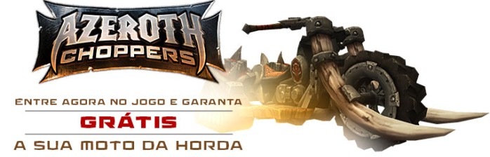 A Blizzard divulgou hoje como será possível conseguir a montaria/moto de Azeroth Choppers no jogo! E sim, como dito antes, ela vai ser gratuita: basta fazer login em sua conta do WoW de hoje, dia 24/07, até o dia 30 de setembro de 2014, para que sua conta seja marcada como elegível para a montaria. Logo que a expansão Warlords of Draenor for lançada, você receberá sua moto!