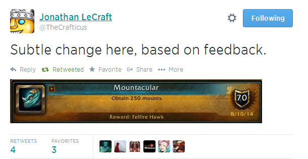 A “Mountacular” (que ainda não sabemos a versão traduzida para pt-br) será próxima conquista dessa série, com a chegada do Warlords of Draenor, sendo necessário obter 250 montarias para ganhar a conquista. Na primeira divulgação da notícia, anunciaram que a montaria de recompensa seria um Draco Emeralda, mas, após o mimimi inúmeros pedidos de jogadores, a recompensa foi alterada: