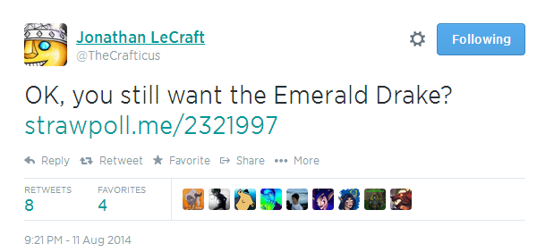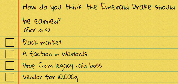 Porém, ao pessoal que curtiu o Draco Emeralda, não precisam ficar tristes! A Blizzard está pensando em uma forma de implementá-lo no jogo e criaram até uma enquente pedindo sugestões: