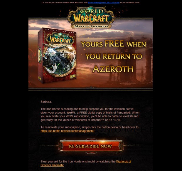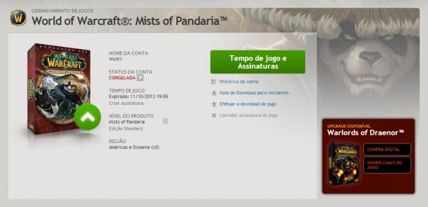 Portanto se você deixou de jogar World of Warcraft em algum ponto e também não comprou a expansão Mists of Pandaria confira seu e-mail, possivelmente você foi premiado com a expansão :). Mesmo recebendo a expansão gratuitamente, é necessário reativar sua assinatura para jogar normalmente.