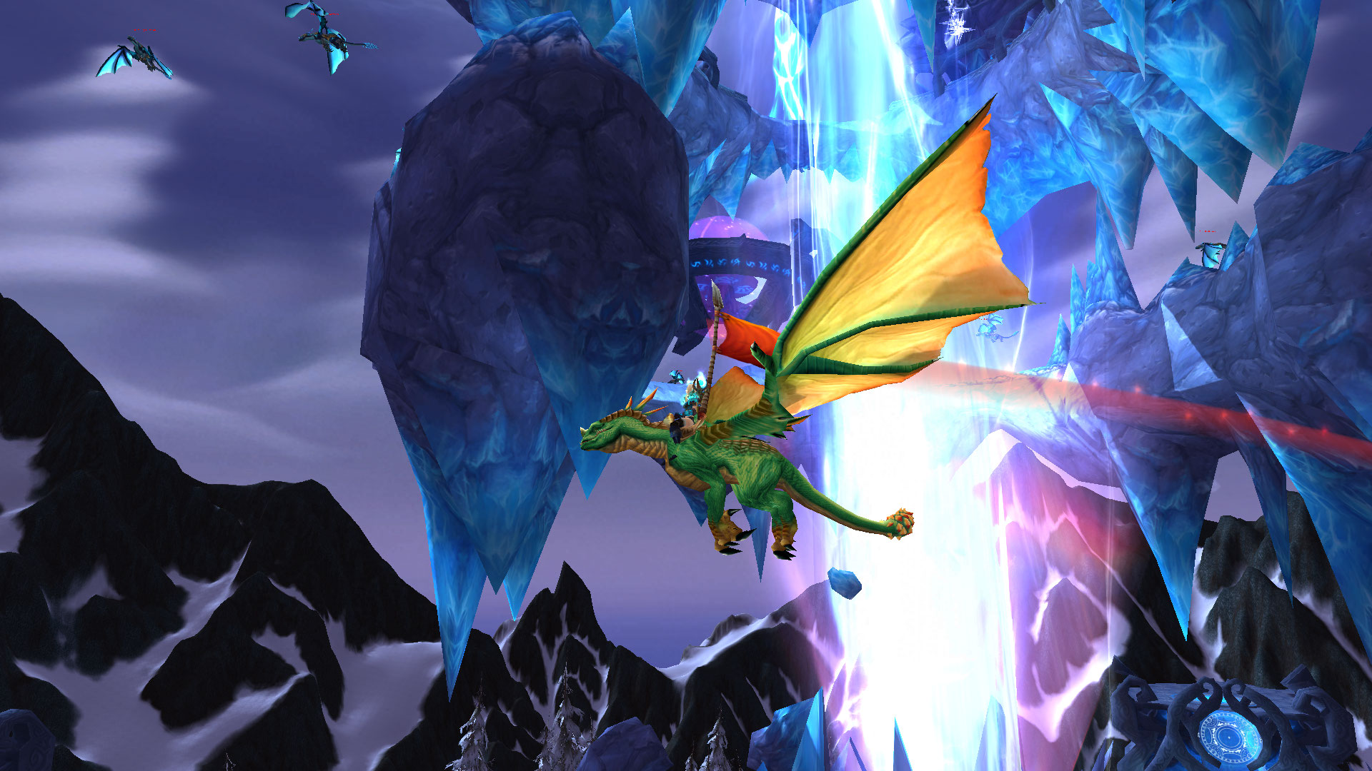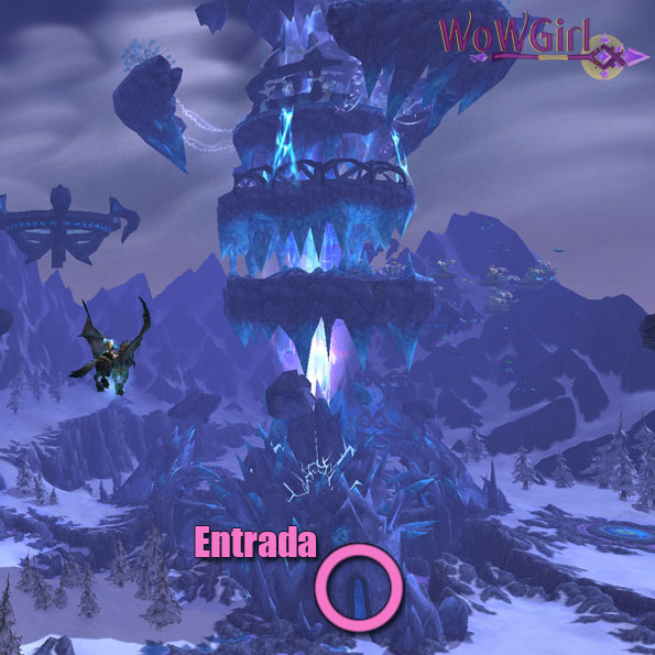 Os dracos Rédeas do Draco Lazúli e Rédeas do Draco Azul tem chance de vir no saque do chefe Malygos, o único chefe da raid Olho da Eternidade nas dificuldades tanto 10 quanto 25 jogadores, semanalmente. O Draco Azul tem uma chance de 5% e o Lazúli, aproximadamente 3%. A entrada da raid fica na região de Gelarra, na Tundra Boreana, no continente de Nortúndria. Quem nunca foi na raid, às vezes apresenta um pouco de dificuldade de encontrar a entrada, mas não tem segredo! Chegando na região de Gelarra, você irá avistar essa grande torre. Basta seguir a indicação da imagem para encontrar a entrada. Uma vez dentro da torre, existem 3 portais: O mais alto deles, de uma cor meio esverdeada, é a entrada para o Olho da Eternidade. O Malygos é solável (ou seja, você consegue derrotá-lo sozinho, mesmo sem muitos equipamentos) e em breve pretendo fazer um guia mais específico sobre o assunto. Ambas as montarias tem chance de aparecer no Mercado Negro e o Draco Azul tem uma pequena chance de vir na sacolinha Algibeira dos Mistérios Exóticos, recompensa do Localizador de Masmorra. Além disso, o Draco Azul também pode vir como saque do Guardião de Meridianos Éregos, último chefe da masmorra Óculos e o meu foi conseguido dessa forma!.