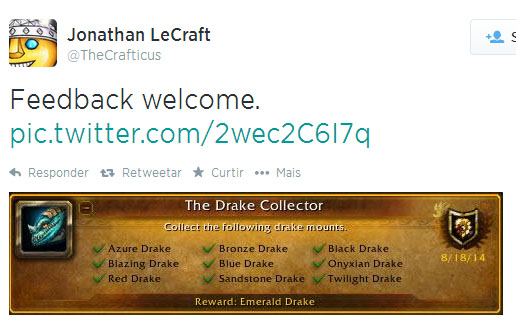 Bom diiia Azerothianos do meu coração! Tudo bem? Vocês se lembram que semana passada, fiz um post sobre o Felfire Hawk, nova recompensa das 250 montarias? Se sim, vocês também acompanharam que estava sendo realizada uma enquete para implementar o Draco Esmeralda no jogo. A boa notícia é que foi divulgado no twitter do Jonathan LeCraft o seguinte post: