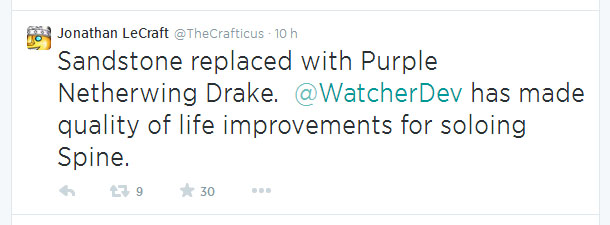 “Draco de Arenito será substituído por Rédeas do Draco Asa Etérea Roxo. @WatcherDev está facilitando a vida de quem pretende solar o Espinhaço do Asa da Morte.”