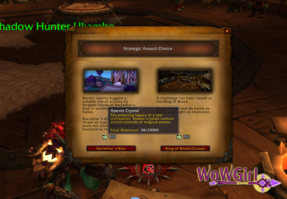 Diversos equipamentos podem ser comprados em Ashran utilizando o Apexis Crystal como moeda (ex.: Refractory Heartcloak) e existem algumas versões com upgrades testes mesmos equipamentos utilizando o item anterior e esta moeda. Até agora é possível vê-las como recompensas de diversas missões da Guarnição e como uma chance de recompensa de alguns PNJs em Draenor. Ela vem também como recompensa de um cenário que localizei dentro da Guarnição, The Coliseum. Após completar este cenário, recebi por correio uma caixa contendo um prêmio em outro e alguns Cristais.
