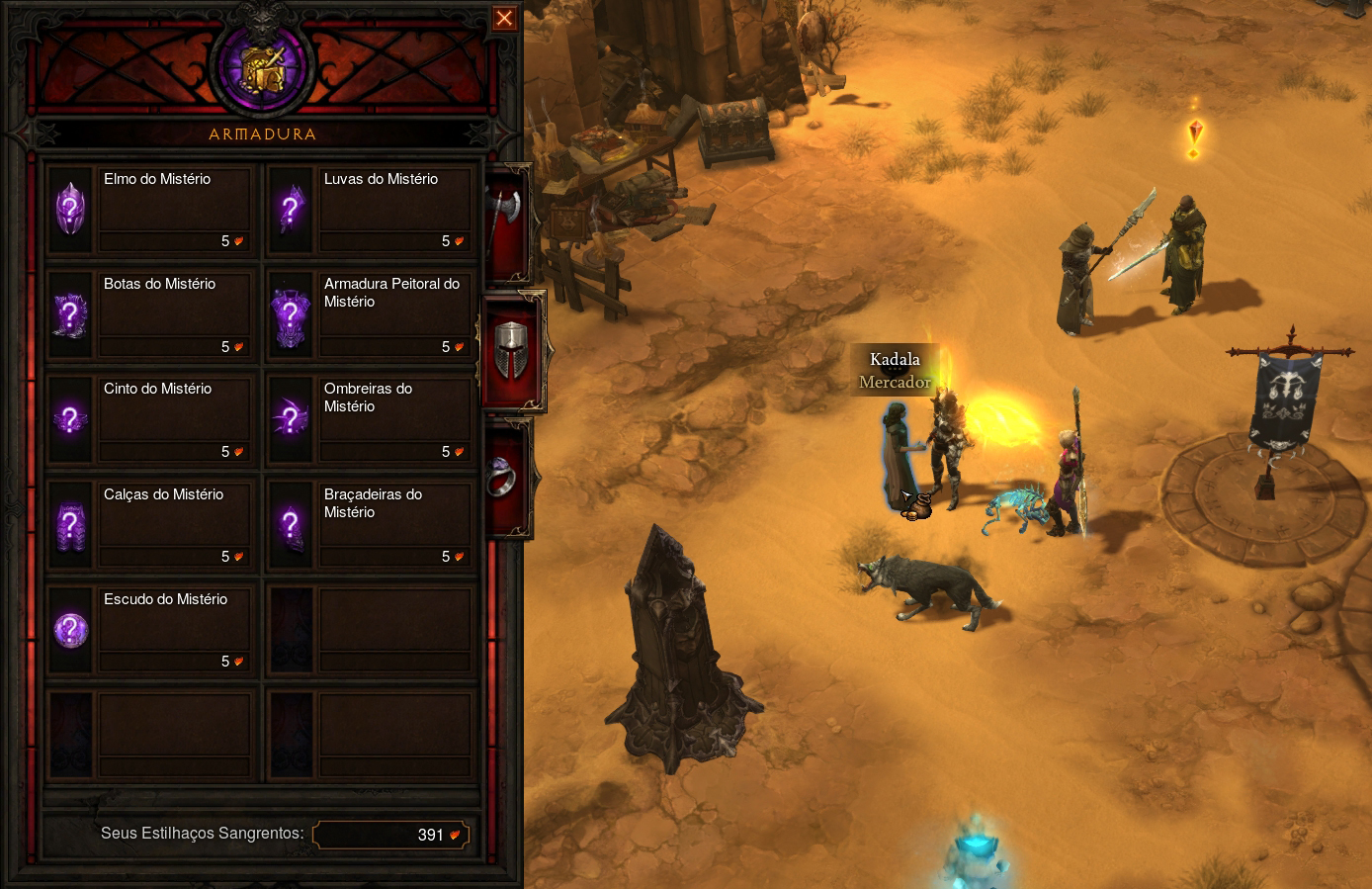 Também é possível obter itens lendários ao trocar seus estilhaços sangrentos por itens. Estilhaços sangrentos podem ser obtidos ao completar Caçadas e Fendas Nefalem no modo Aventura. Os itens custam de 5 a 20 estilhaços e ao trocá-los, há uma chance deles serem lendários. Para trocar seus estilhaços por itens, visite a mercadora Kadala na cidade.