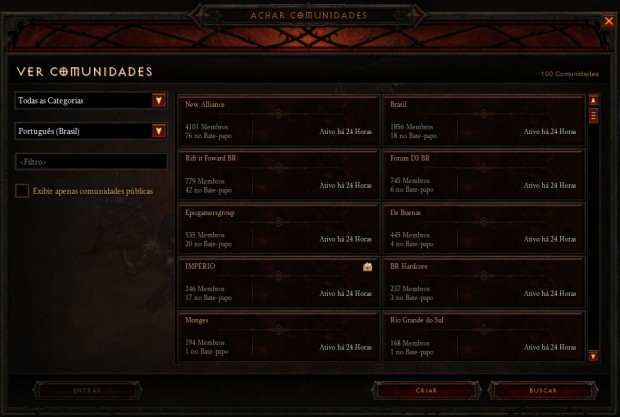Para procurar comunidades que se adequem melhor ao seu estilo de jogo, você pode escolher uma categoria de comunidade para te ajudar em Diablo III. Há comunidades especializadas em classes, comunidades para jogadores do modo de jogo Hardcore, comunidades feitas por streamers e personalidades, comunidades regionais (onde você pode encontrar pessoas que estejam próximas de você), etc.