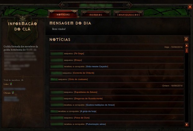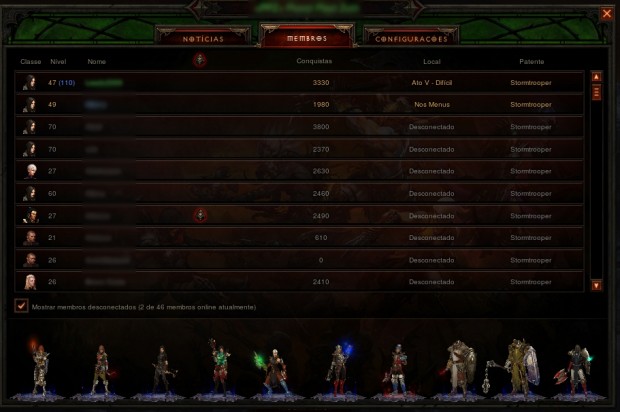 Na aba “Membros” você pode ver informações detalhadas das outras pessoas do seu clã, tais como patentes, local de jogo, atividades em tempo real, pontos de conquista e até mesmo detalhes do personagem que eles estão jogando.