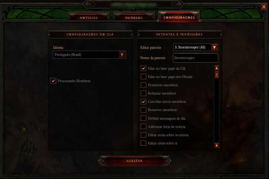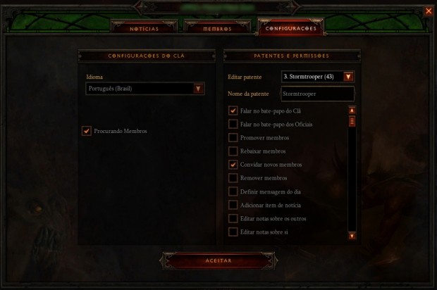 Por último, na aba “Configurações” você pode ver as configurações de seu clã, mas elas só podem ser modificadas pelo dono ou os oficias do clã. Também nela é mostrada a língua oficial daquele clã, as permissões de cada patente e se o recrutamento está em aberto ou não.