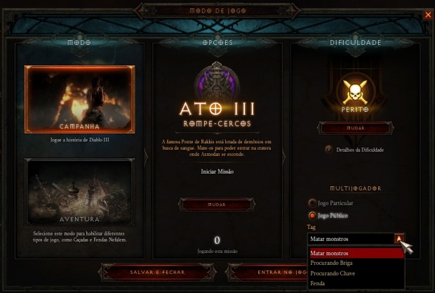 Se você gosta de ter companhia enquanto joga, em Diablo III você possui a opção de deixar seu jogo disponível para que outras pessoas participem dele com você, e assim cooperem mutuamente. É possível jogar com até mais 3 pessoas num mesmo jogo, e essas pessoas serão adicionadas de acordo com o nível do seu personagem (os níveis serão bastante similares, nem sempre serão exatamente os mesmos). Ao colocar “Entrar no Jogo”, você e quem mais participar do jogo serão colocados na missão escolhida.