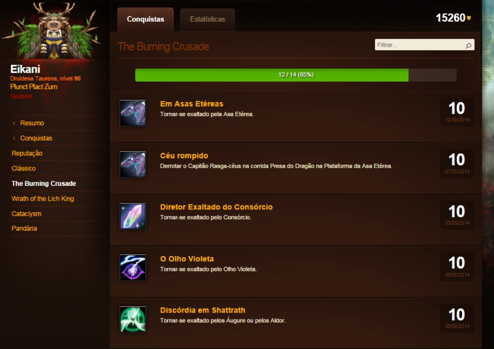 A primeira coisa que recomendo que faça é: aperte Y e dê uma boa olhada nas suas conquistas, em todas as categorias. Veja quais você tem mais, quais tem menos, e abra todos os requerimentos delas, clicando, pra ver se não tem conquistas que você está quase terminando e nem sabe. Depois, estabeleça metas: quer fechar o máximo de conquistas de missões? Estude elas, veja se a gente já tem guias aqui, ou visite o WoWHead, nosso amigo. Quer fechar reputações? Veja no seu resumo de personagem (atalho padrão C, aba Reputações) quais você está mais próximo de ficar Exaltado, confira aqui como é o farm dela e estabeleça seu calendário de missões/diárias/raides/masmorras – algumas delas dá pra fechar em poucas horas mesmo saindo do neutro.