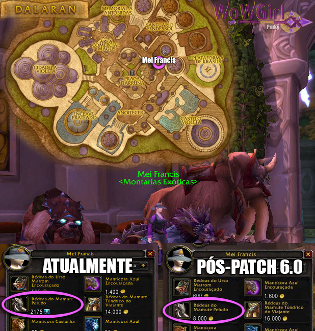 A PNJ Mei Francis fica em Dalaran (próxima à base horda) e vende as Rédeas do Mamute Peludo pela bagatela de 2175x Pontos de Justiça. Com a implementação do 6.0 no PTR, descobrimos que esse preço irá mudar e passará a custar 8000 de ouro!! Isso mesmo, 8k de gold!! – Vale a pena lembrar que esse é um mamute que não dá direito à passageiros extras. Você também pode obter desconto caso esteja em uma guilda com Pechincha (liberada no nível 24 da guilda) e tenha reputação com Kirin Tor.