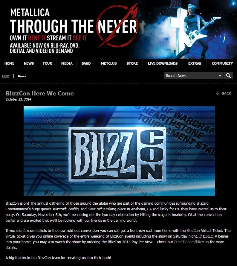 Se por um acaso faltava algum motivo para vocês irem ou comprarem o Ingresso Virtual da BlizzCon 2014, agora não falta mais! Foi divulgado hoje no site oficial que a banda americana Metallica fará o show de encerramento do evento, se apresentando para uma convenção lotada na noite de 8 de novembro!
