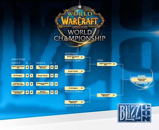 Olá pessoal, acabou o campeonato de arenas de World of Warcraft, e a equipe campeã foi a Bleached Bones, formada pelos jogadores, Lagyna (o russo Gaponov Sergei, que joga de bruxo), Lazerchicken (o sueco Anton Engström, que joga de druida) e Loony (o também sueco Martin Moazzez, que joga de xamã). A Bleached Bones participou de diversos torneios, incluindo os regionais da Europa de 2011 e 2012, o Battle.net World Championship (BWC) de 2012 em Xangai e o Arena Global Invitational de 2013. Eles têm experiência em batalha e estão prontos para provar que podem vencer na BlizzCon. E venceram!