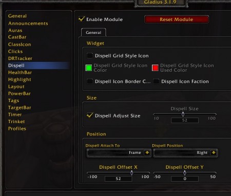 Estes menus também oferecem personalização considerável para cada módulo. Você pode encontrar os buffs e debuffs no menu Auras, e o DR Rastreador no menu DRTracker. A imagem acima mostra o menu de dissipação, e simplesmente marcando ou desmarcando “Enable Module” irá ativar e desativar a exibição relevante.