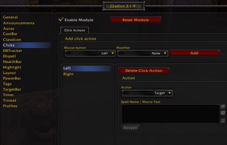 Há várias ações que podem ser atribuídas para o left-click (clique com botão esquerdo) ou right-click (clique com botão direito): Alvo, Foco, Macro ou Cast Spell. Isso pode ser substituído por macros mouseover, mas é um recurso útil se você não usa regularmente mouseovers. Você também tem a opção de adicionar modificadores paraos cliques esquerdo e direito e você terá o Gladius executando ações para você na arena.
