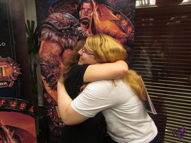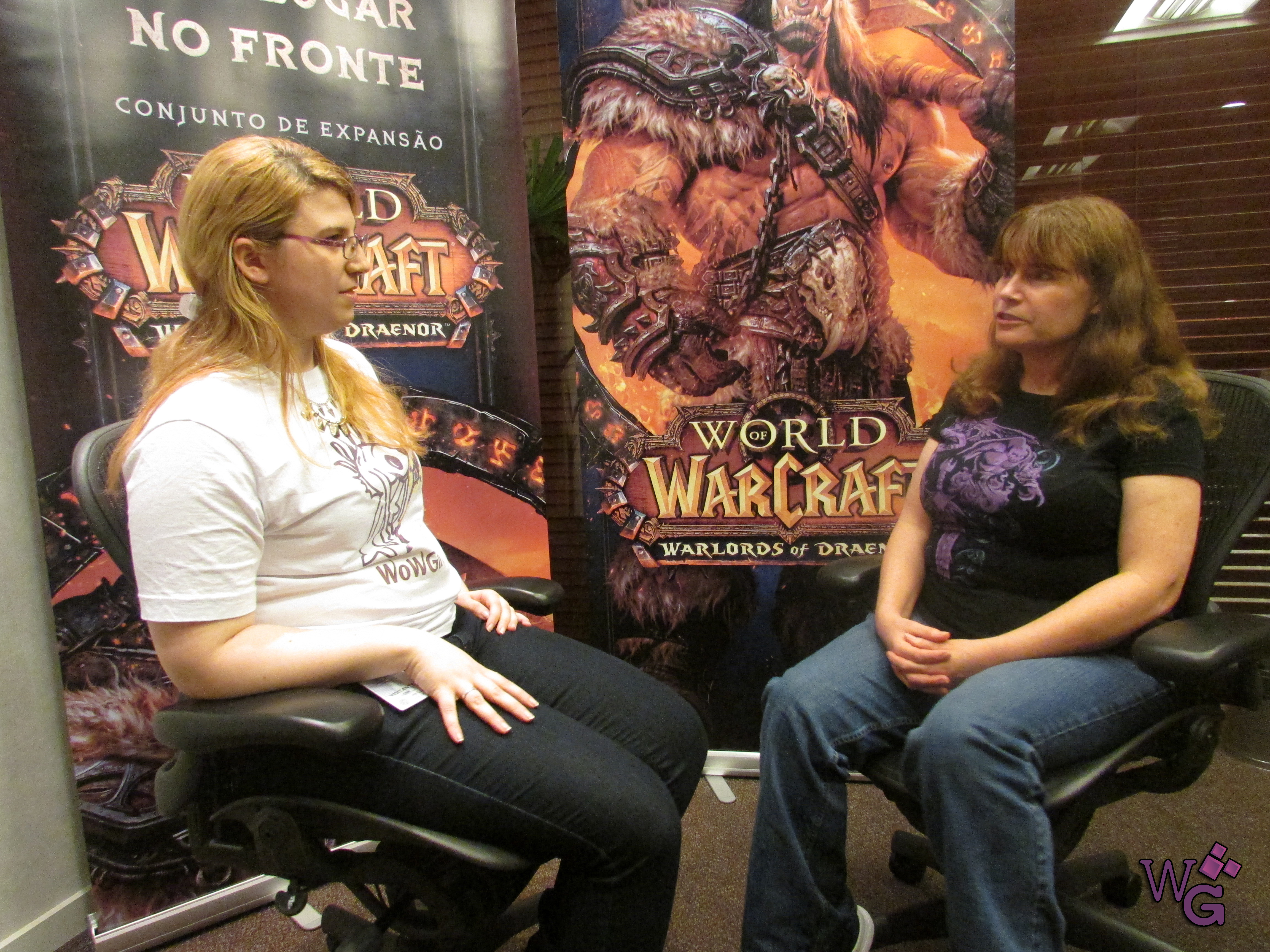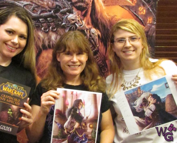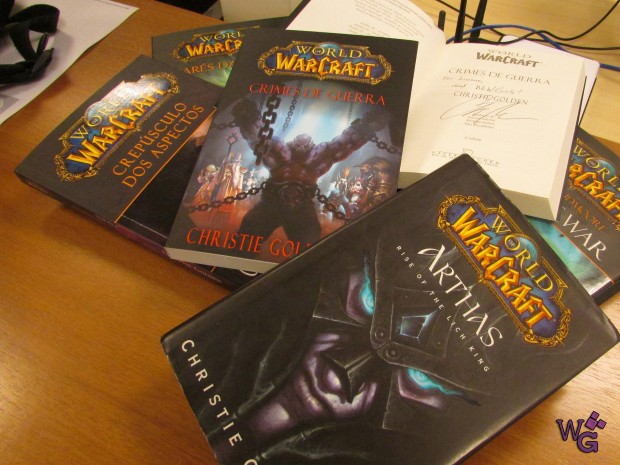 Conversamos sobre o processo de desenvolvimento dos livros. Como funciona, se ela recebe um guia da Blizzard, se ela tem liberdade. E depende do projeto, existem projetos que a Blizzard sabe exatamente o que quer fazer e passa ordens expressas para ela desenvolver em narrativa, as vezes ela tem mais liberdade. O Crimes de Guerra foi um projeto que, para desenvolver, ela viajou para Irvine, sentou com os CDevs e teve liberdade de trabalhar a história. Ela fez muita pesquisa para escrever o julgamento, que era o pretexto e coluna vertebral do livro, e disse que foi bom poder trabalhar com tantos personagens diferentes juntos. Eles conversam, jogam idéias na mesa e vão debatendo. Também depende muito de o quanto ela está envolvida, as vezes a Blizzard não tem certeza de uma coisa e ela assume esse papel de “deixa comigo!”, se eles não gostarem, eles podem tirar, afinal o livro é deles, a história é deles, então está tudo muito na mão da Blizzard, e com o aval da Blizzard. No caso do Crimes de Guerra eles sabiam que teria um julgamento, não saberiam o que iria acontecer, quem estaria lá. Então ela aproveitou isso para desenvolver alguns personagens e seus relacionamentos, como a Vereesa e a Sylvana, Jaina, Baine…