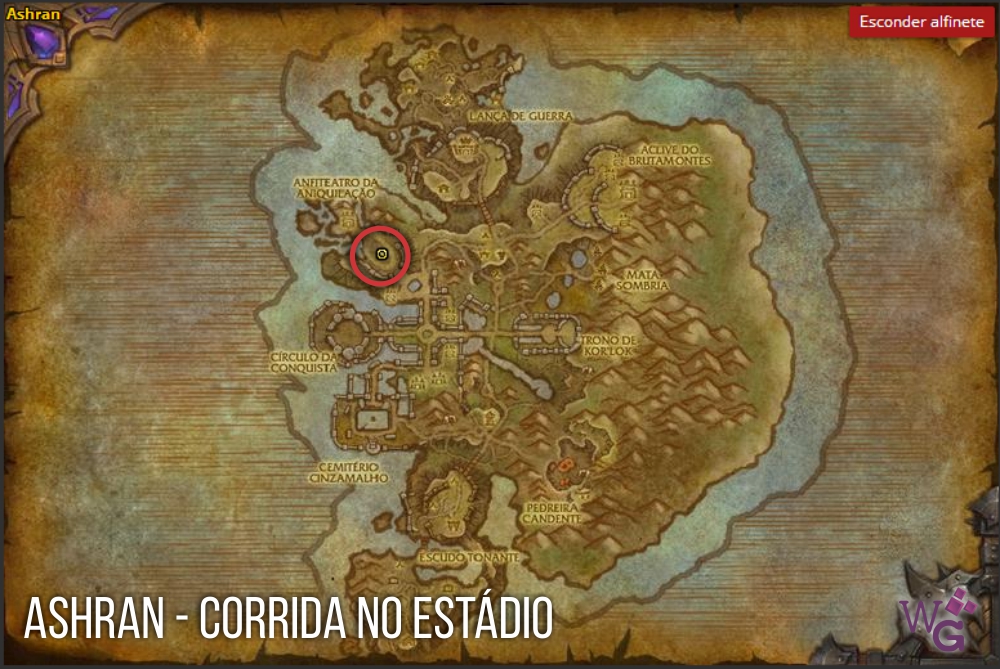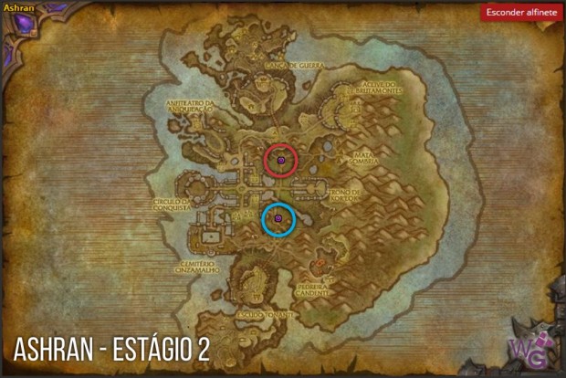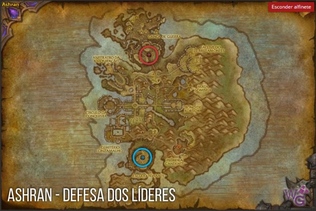 No mapa acima, veja que existe um caminho bem definido ligando a base da Horda e da Aliança. Ele é conhecido com o Caminho da Glória. Nele, existem 7 pontos principais, marcados com pinos no mapa, e os dois finais são o da Horda (vermelho) e Aliança (azul). O objetivo dos pontos finais é matar o líder da facção inimiga, como explicado acima. O objetivo de todos os outros pontos é capturar a ‘bandeira’ no estilo de Olho da Tormenta. Se seu time pegar essa bandeira, o objetivo do campo de batalha é ‘empurrado’ em direção ao time oposto em um ponto, como se fosse um passo dado em um cabo de guerra. Existem outras vantagens e objetivos em cada ponto de interessa marcado, que vão ser detalhadas abaixo: