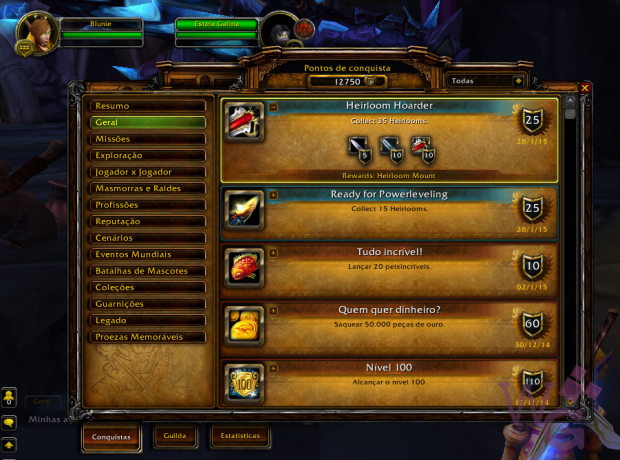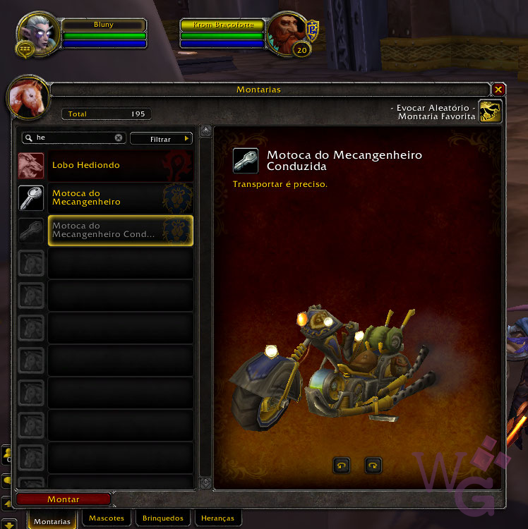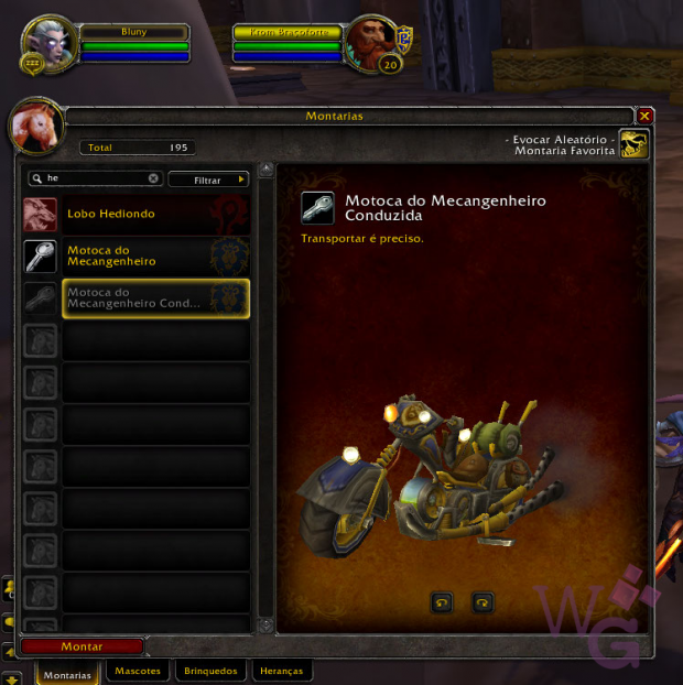 A conquista Heirloom Hoarder (sem tradução oficial ainda) te dará uma montaria Chauffered Chopper que poderá ser usada a partir do nível 1 – não, você não vai montar ela, e sim, vai ter um ~choffer~ pra te carregar – e para ter essa recompensa você precisa ter um total de 35 itens de herança.