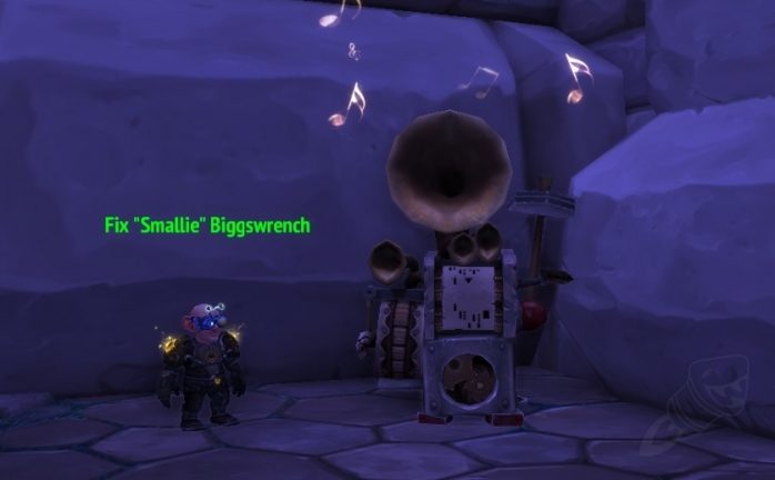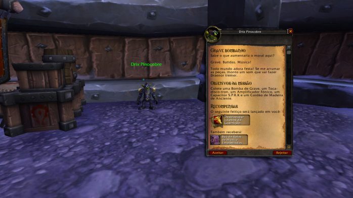 Você encontrará a missão para iniciar a criação da Jukebox com um NPC em sua Guarnição. Do lado da Aliança, a missão Grave bombando estará disponível com o NPC Fix “Polegar” Chavegrande e no lado da Horda, o NPC Drix Pinocobre disponibilizará a missão homônima, Grave bombando. Ambos são encontrados do lado de fora da porta da Prefeitura, então não tem erro!