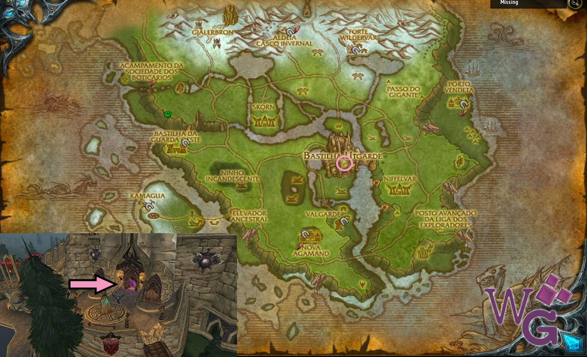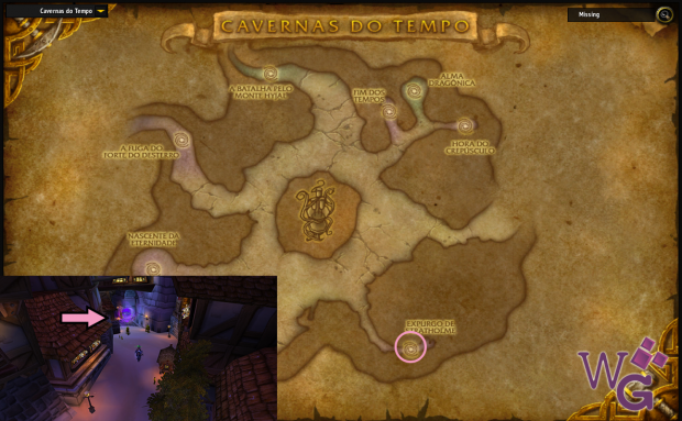 Já Expurgo de Stratholme, fica nas Cavernas do Tempo. A melhor maneira de chegar nas lá, tanto para Horda quanto para Aliança, é através do portal para Dalaran. Chegando em Dalaran, vá até a Cidadela Violeta e pegue o portal para as Cavernas do Tempo.