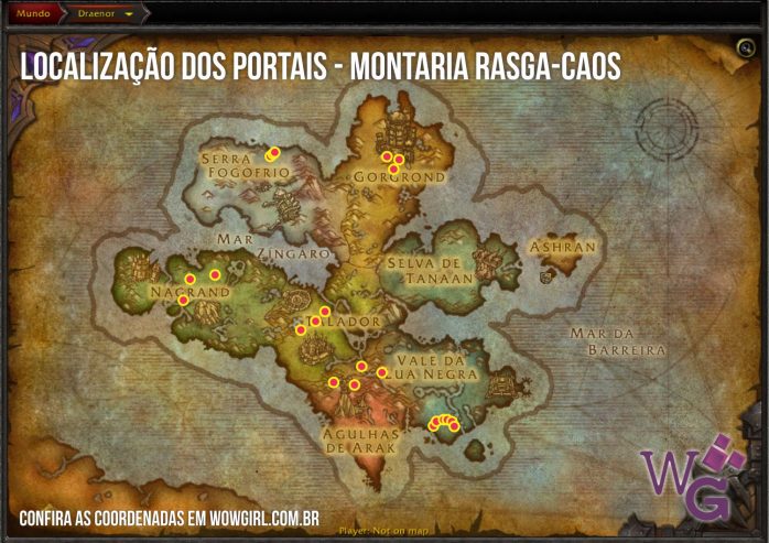 *Existem mais dois possíveis spots, um em Vale da Lua Negra e um em Talador – mas como não encontrei nenhum print mostrando a localização exata, achei melhor não menciona-los. Se encontrar algum outro ponto de spawn do portal, tire um print e mande pra gente com as coordenadas!