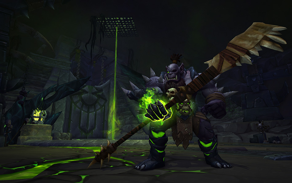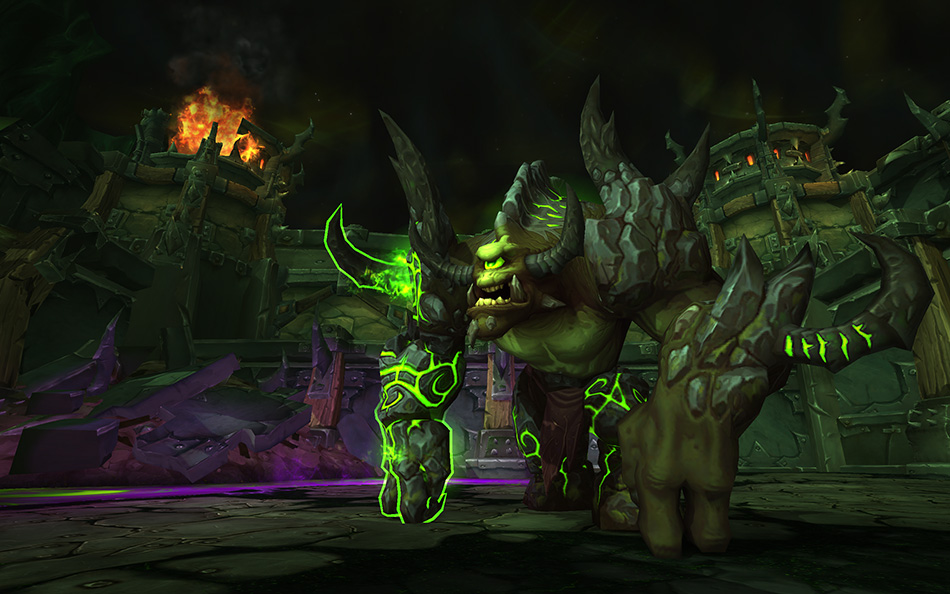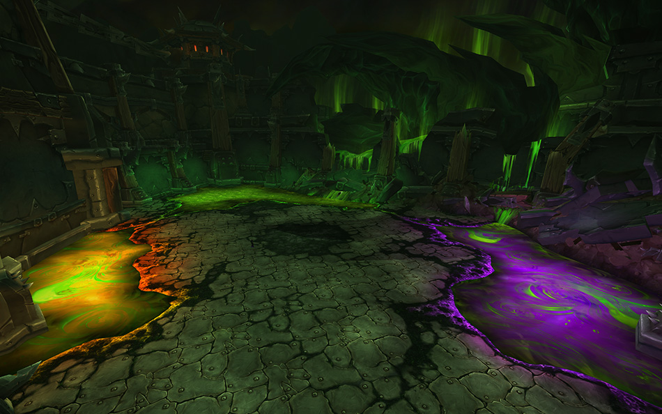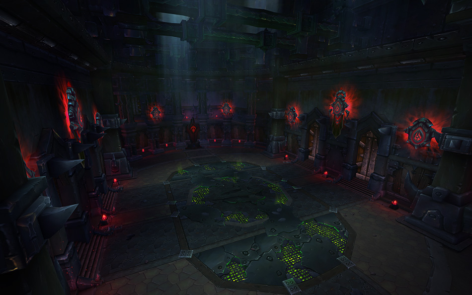 Observações do Designer: O primeiro pavimento da Cidadela Fogo do Inferno é um reflexo de como a Horda de Ferro era antes da influência de Gul’dan, enquanto os superiores passam mais a imagem do Concílio das Sombras e da Legião. Junto com o maquinário de cerco, as feras enormes de Gorgrond eram o eixo principal da força invasora da Horda de Ferro. Assim, não surpreende que Gul’dan tenha tentado corrompê-las e potencializá-las com energias vis.