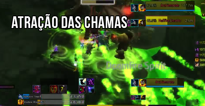 Quando Arquimonde lançar o primeiro Atração das Chamas, o tank deve movê-lo para o lado oposto da sala, e os ranged devem seguí-lo, mas dessa vez espalhando-se. O Estouro de Sombra Vil será lançado em seguida, e é imperativo que apenas o alvo seja lançado para cima (novamente, cuidado com a distância). Todos os outros ranged deverão rapidamente stackar embaixo da marca da aterrissagem, e dividir o dano da explosão. Após isso, podem stackar normalmente. Só separem-se novamente após a próxima Atração das Chamas.