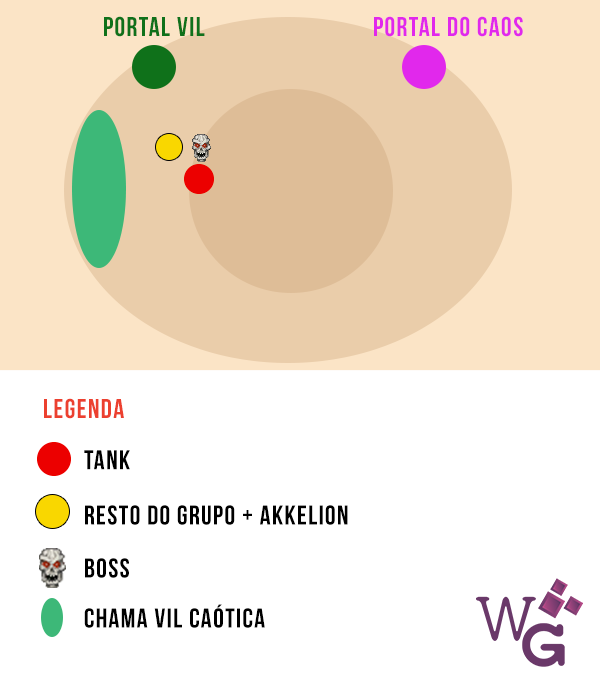 Bom, acho que todo mundo entendeu que colocar o fogo no lugar errado é ruim. Então, vamos às próximas habilidades: o tank que estiver com o boss deve usar um cooldown defensivo na hora do Golpe Vil, e o tank que estiver com Akkelion deve usar seus cooldowns na hora da Rajada de Chamavil. Os jogadores presos pelas Correntes Vis devem correr uns dos outros para se libertarem rapidamente.