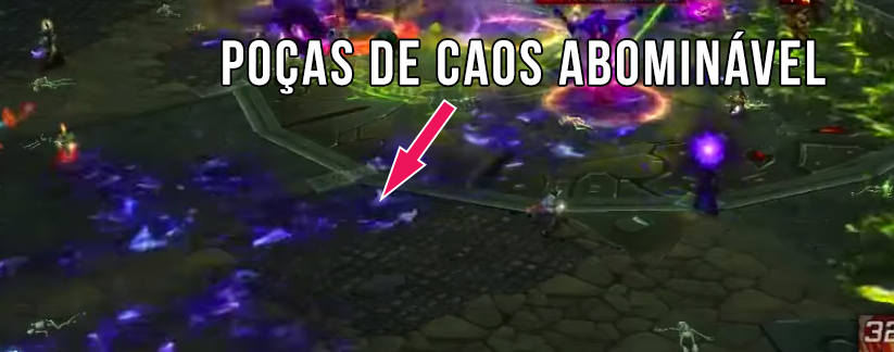- Passo do Caos Volátil: Teleporta para o local de um jogador próximo, causando 90k de dano de sombra aos jogadores no local onde ele surge. Cria uma poça de Caos Abominável (fogo roxo) se atingir algum jogador nesse processo. O local onde ele vai surgir ficar marcado por uma fumacinha roxa.