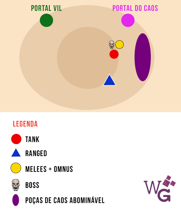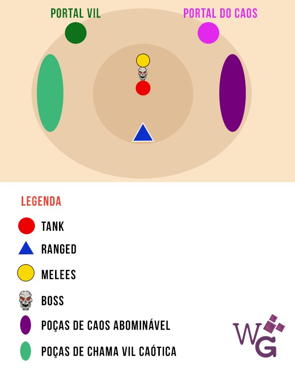 Matem rapidamente os Demônios do Caos Instável. Eles são prioridade absoluta de alvo! Saiam de cima das fumacinhas para não serem pegos pelo Passo do Caos Volátil e criarem mais fogo roxo.