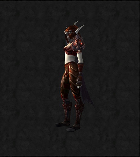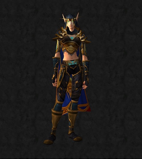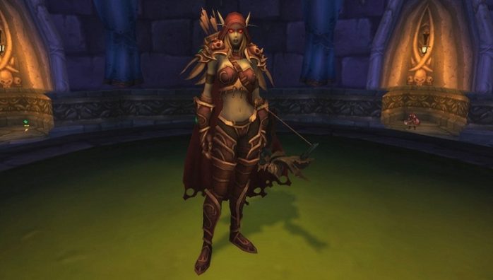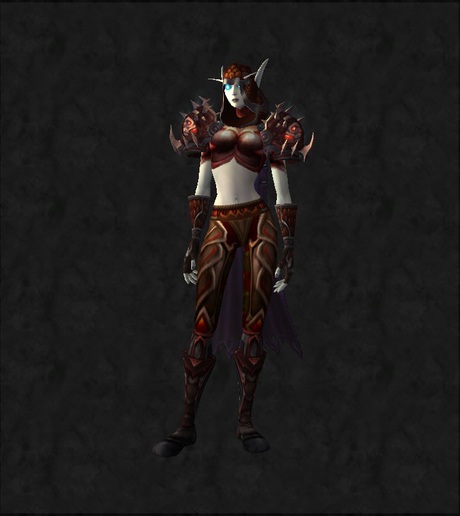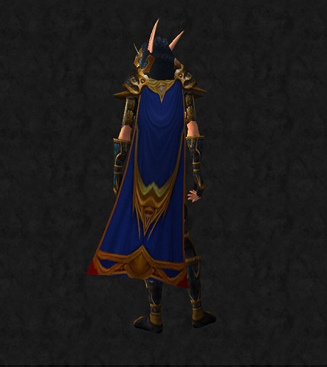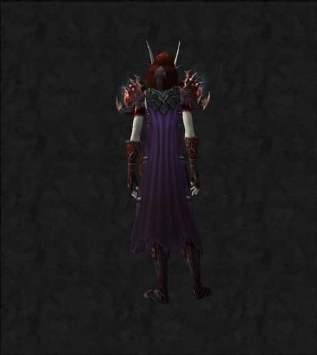 A capa é o item tretas desse conjunto. A parte boa é que ela é praticamente igual a que a Sylvana usa, com esse efeito destruído, a parte ruim é que ela é um item da atual season de PvP (custa 1250 pontos de honra). Caso você não faça PvP pode substituir por qualquer capa simples em vermelho ou roxo escuro que vai ter um efeito bem legal da mesma forma.