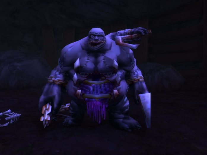 Brothogg, o Senhor de Escravos. tinha bem uns três metros de altura, um e meio de largura e uma cara tão feia que já devia ter matado muita gente de susto. Isso sem contar a barriga toda aberta, as entranhas podres se arrastando pelo chão e os ossos expostos, além dos três braços, cada um deles carregando uma arma mortal. E o cheiro…