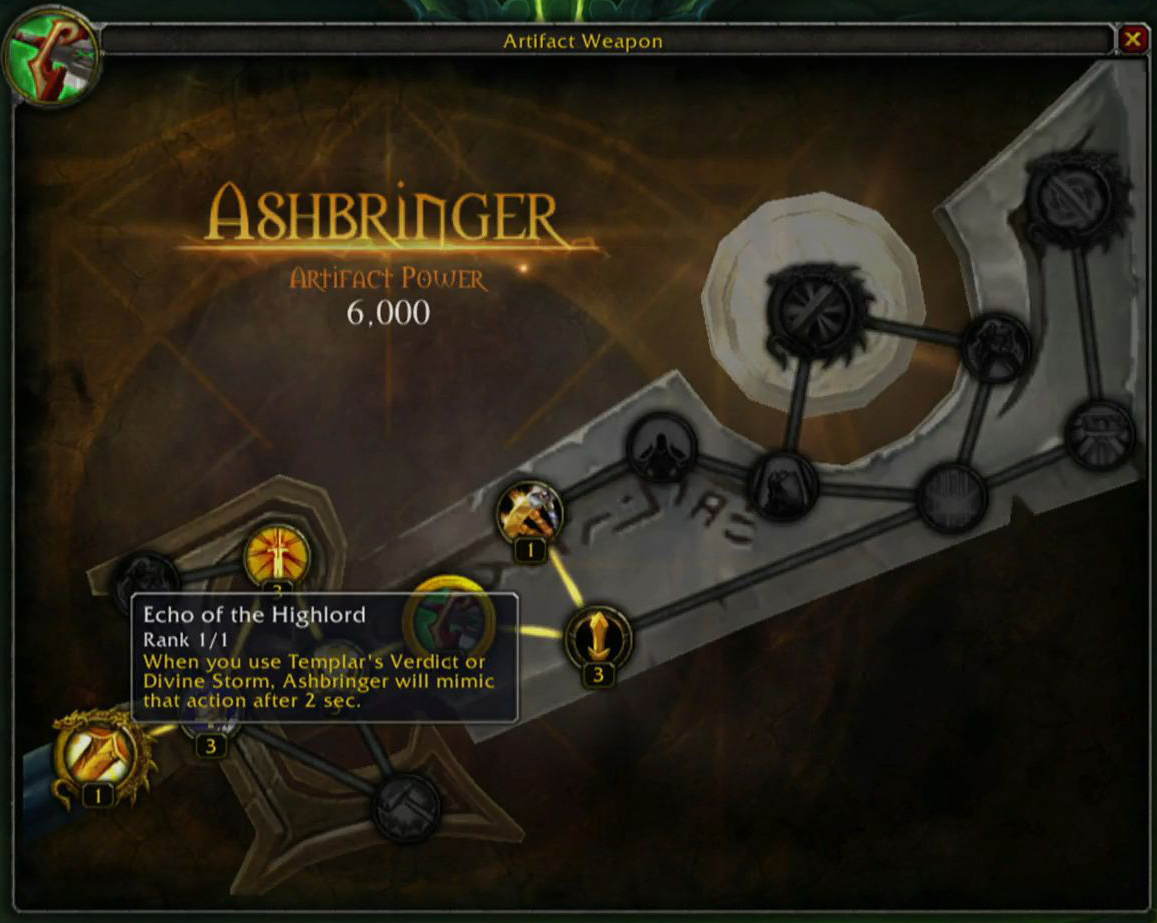 Cada um destes artefatos possui uma espécie de Árvore de Talentos, semelhante aos talentos de classe usados antes da mudança em Mists of Pandaria, onde várias melhorias poderão ser feitas, desde melhorias em habilidades de batalha, bem como funções únicas como o par de espadas para Cavaleiros da Morte Gélidos, que poderá ser melhorada para permitir que o próprio Caveleiro da Morte se reviva em combate com a habilidade Reviver Aliado.