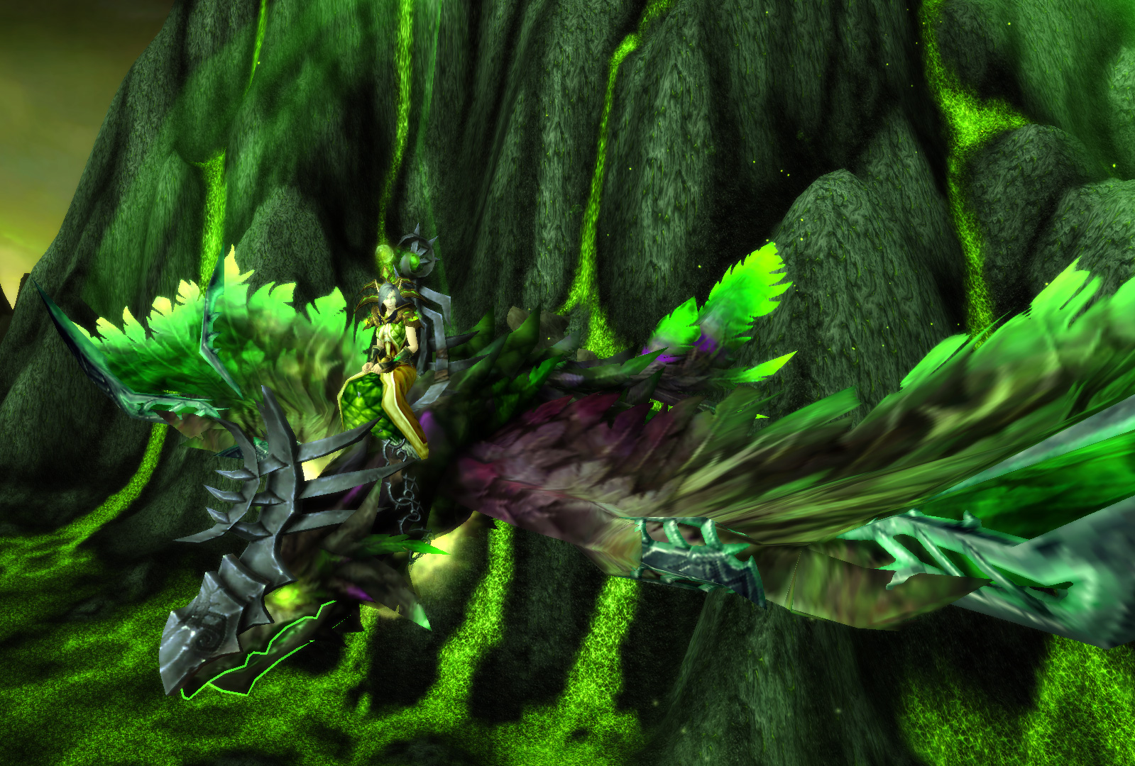 Parece bobeira, mas um mínimo detalhe faz toda diferença em um transmog com este conjunto para bruxos. O Glifo de Esfera Verdejante fica perfeito caso esteja usando a peça de cabeça e ombros *-*~. Um outro plus para combinar com qualquer conjunto feito com base nestas três peças é a montaria Terrorasa Corrompido. Os melhores 150.000 cristais de apexis gastos na expansão 😉
