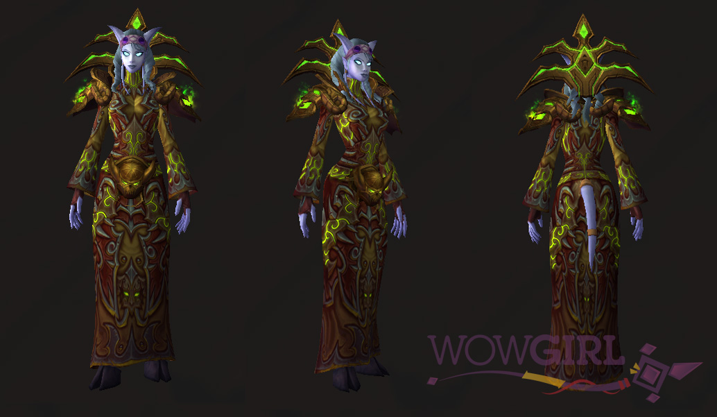 Para esta sugestão, levarei em conta que você ainda tem alguns itens da versão Localizador de Raide do Trono do Trovão. Este vestido pode ser encontrado em 3 versões diferentes, sendo uma exclusiva para bruxos (tier), e as outras duas servem para qualquer classe. A coloração verde, que combina com as peças do Conjunto Lorde Eredar, só pode ser obtido na versão LdR, e talvez seja um pouco complicado de se consegui-la atualmente. Neste set, utilizei os seguintes itens: