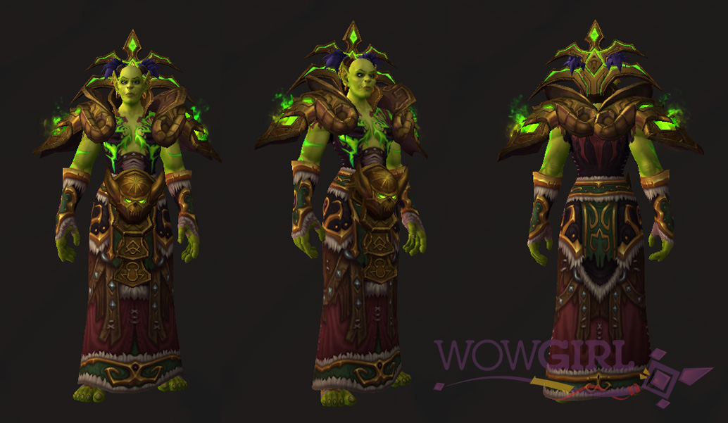 Para esta sugestão, é necessário ter completado o Modo Desafio de Masmorras de Pandaria com medalha de ouro, pois nela utilizamos 2 peças deste conjunto. Apesar dos tons de marrom/roxo, o set de Modo Desafio foi minha primeira opção quando completei todas as peças do Conjunto Lorde Eredar. Veja os itens utilizados: