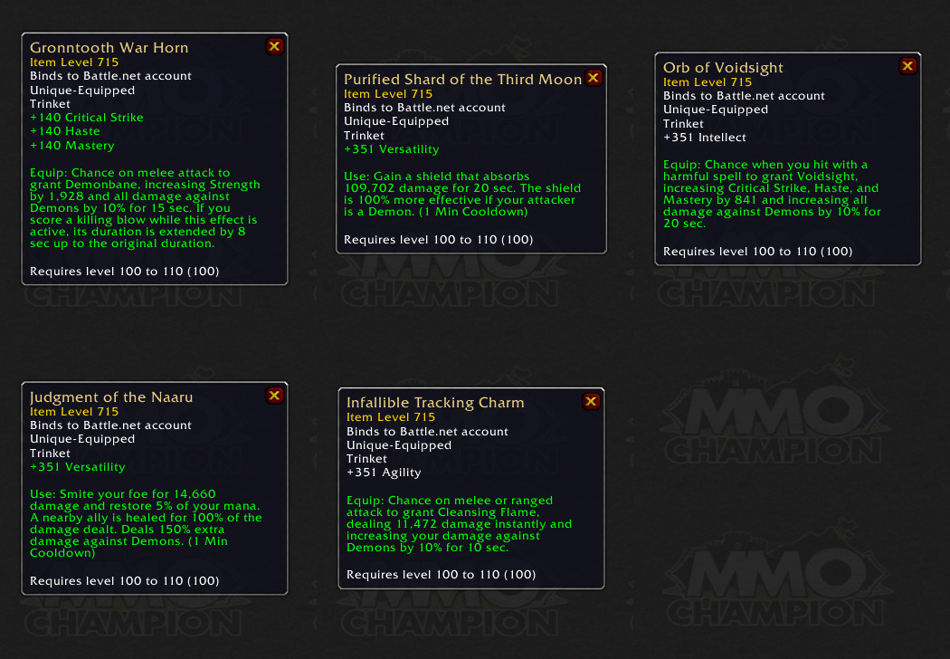 - Berloques de Herança de Masmorras Míticas também serão adicionados. Os status ainda não estão completamente definidos, mas eles vão escalar até o nível 110 – mas você pode ter uma base pela imagem abaixo, também do MMO-Champion: