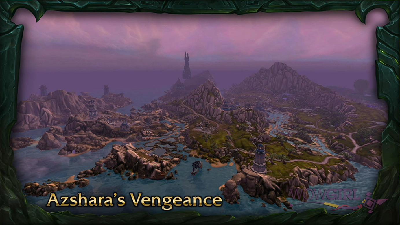 - Azsuna – este local foi devastado pela vingança de Azshara antes da Cisão (the Sundering) e onde ela se aliou à um grande reino marinho, onde iremos encontrar alguns membros da Revoada Azul. Esta zona segue um conceito de arte grego e com elementos de estruturas Noctélficas.