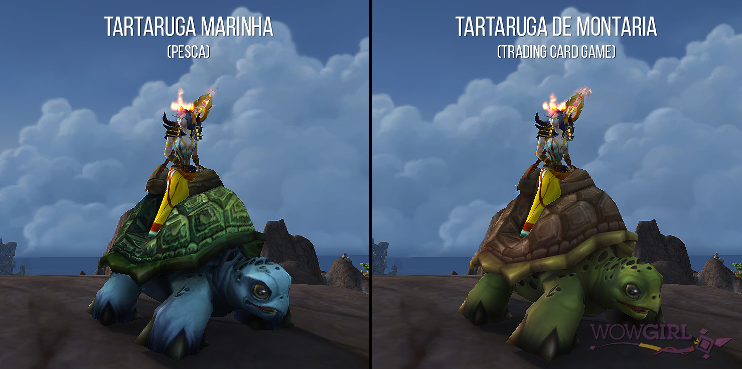 O modelos de ambas é praticamente igual, mudando apenas a cor de cada uma. A diferença principal é que a Tartaruga Marinha é mais comum e pode ser obtida ao pescar em qualquer cardume de Nortúndria, Pandaria, áreas do Cataclysm, Ilha de Negraluna e Draenor. Já a Tartaruga de Montaria até antes de Warlords of Draenor só podia ser obtida ao resgatar um código da carta Saltwater Snapjaw, presente na coleção Heroes of Azeroth, e tinha 1 chance em 484 de aparecer em um booster. Portanto até então ela era muuuito rara de se ver. Outro agravante é que, diferente das outras montarias de TCG, a Tartaruga de Montaria não pode ser vendida através da Casa de Leilões ou através da janela de troca. Ela é vinculada quando apanhada, portanto só era possível mesmo se obter com o código e de vez em nunca através do Mercado Negro.