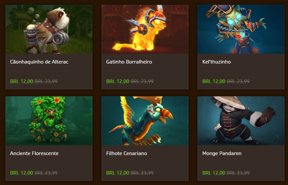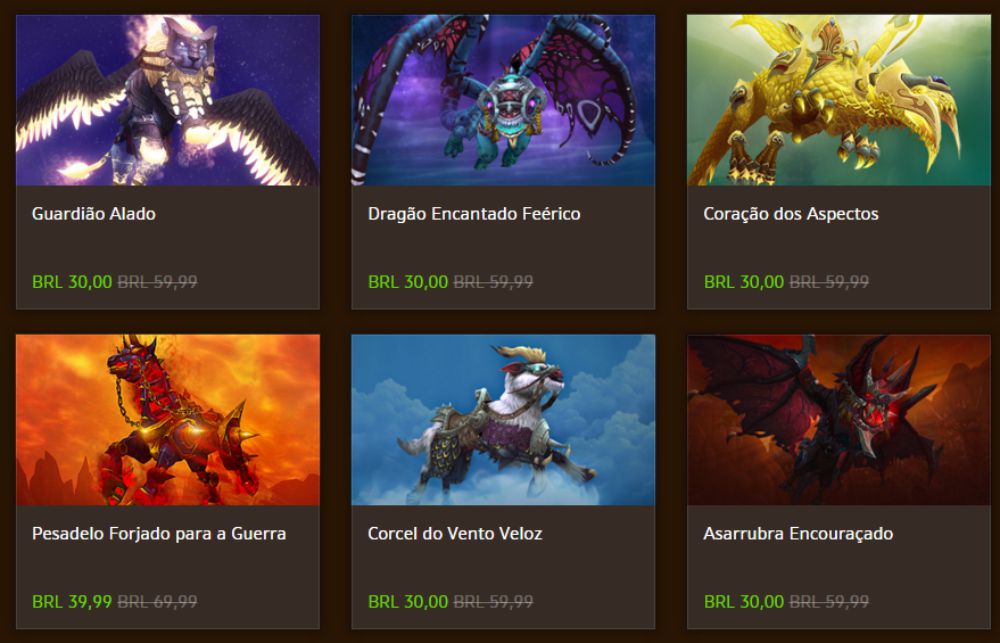 Os mascotes saem por R$12, e as montarias por R$30 (menos o Pesadelo Forjado para Guerra, que sai por R$39,99). Confiram a lista do que está em promoção: