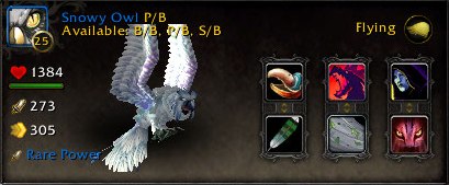 A Coruja da Neve aparece com três possíveis Breeds: P/B, S/B e B/B. Ela é a única coruja que tem o Breed S/B (velocidade/equilibrio). Os melhores breeds para esse mascote são o P/B e o S/B. Como todo mascote selvagem ela pode aparecer em todas as qualidades, desde pobre (cinza) até raro (azul).