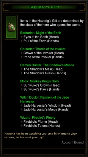 • Completando determinados estágios da temporada, você receberá como recompensa uma “Dádiva de Haedrig”. Juntando as três recompensas, você terá um Conjunto de 6 peças completo. Você poderá conquistar apenas um Conjunto na temporada.
