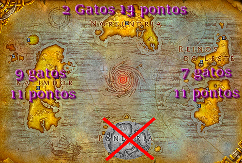 A segunda, seria deixar ele mais difícil de pegar e mesmo assim divertido: ele poderia aparecer em QUALQUER mapa de Azeroth, porém somente em pontos de gatos raros. Seria mais chatinho, sim, mas não iria dividir respawn com a Val’kyr. Nesse caso, a mascote teria 18 raros por toda Azeroth, mas vamos descartar os gatinhos de Monte Hyjal, porque tem muitos mobs em seus arredores, e também o ponto do Skarr. Então, gatos que são feras espirituais, vamos contar somente o Loque’Nahak e o Gondria.